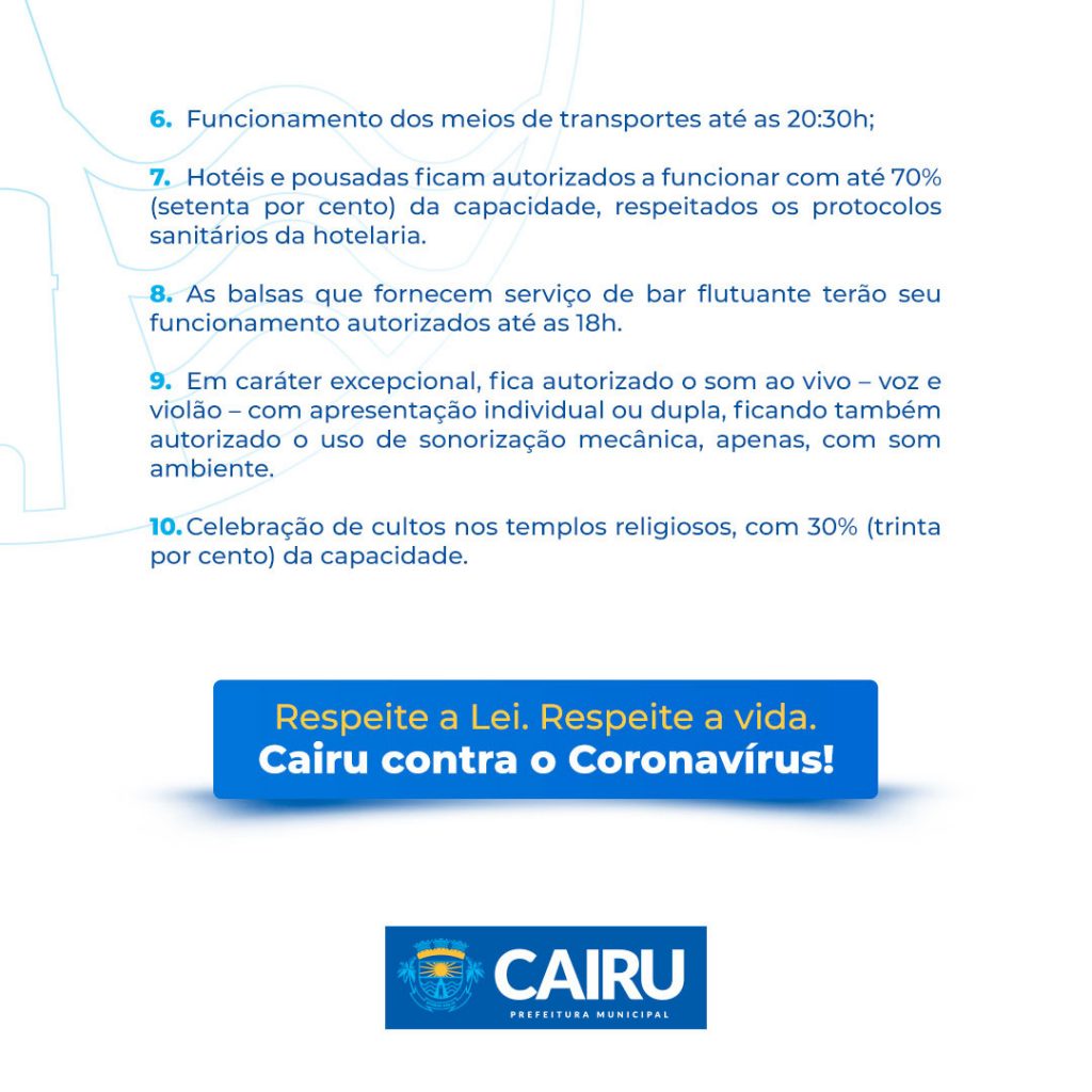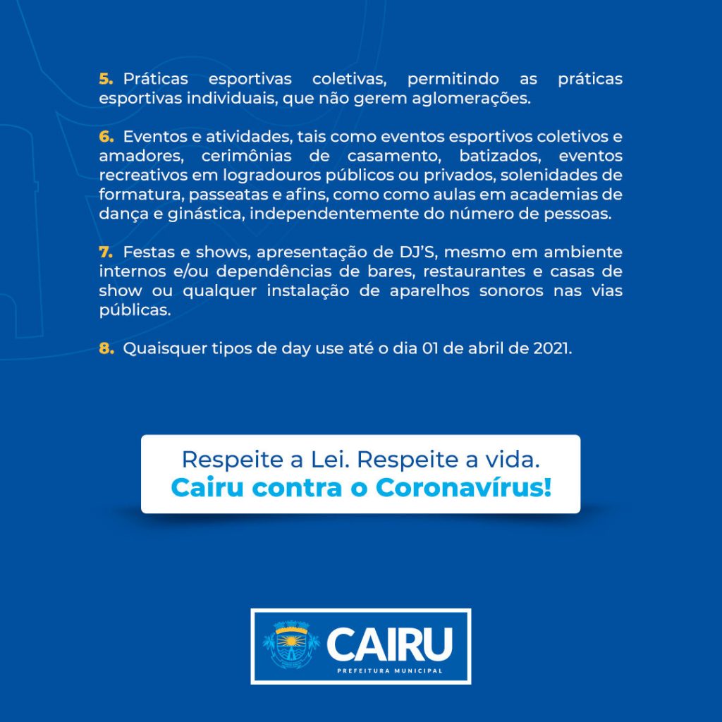 O decreto da Prefeitura de Cairu, de nº 542 de 11 de março de 2021 estabelece novas medidas de combate e controle à disseminação do coronavírus. A novidade do decreto é a proibição de consumo de bebidas alcoólicas nos finais de semana nos espaços públicos, praias, ruas e outros, conservadas, acondicionadas ou transportadas em qualquer tipo de equipamento, dentre eles, COLERS, ISOPORES ou congêneres. Também fica proibida a comercialização de bebidas alcoólicas em QUALQUER estabelecimento, inclusive por sistema de delivery, das 17h do dia 12/03 até as 05h do dia 15/03.