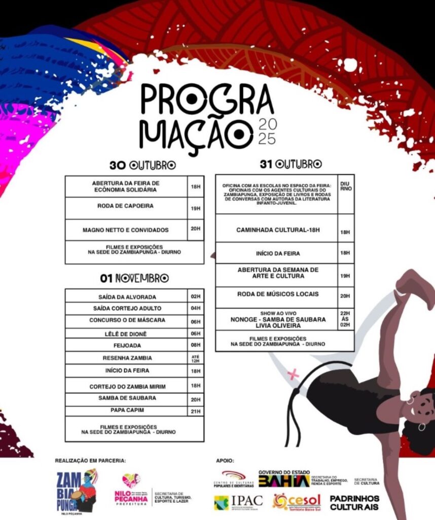 Entre os dias 30 de outubro e 1º de novembro, Nilo Peçanha será palco de uma das mais importantes celebrações culturais do município: a VI Semana de Arte e Cultura Zambiapunga. O evento promete reunir tradição, música, dança, arte e muita energia popular, reafirmando o valor das manifestações culturais que fortalecem a identidade do povo nilopeçanhense.